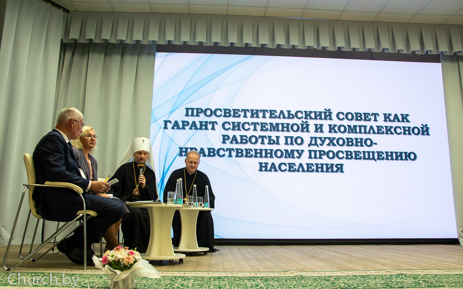Митрополит Минский и Заславский Вениамин, Патриарший Экзарх всея Беларуси, выступил с докладом «Просветительские советы как фактор гармоничного развития сотрудничества Церкви и общества». Архипастырь отметил, что в Минской области выстроена комплексная система взаимодействия государственной власти, учреждений образования, ресурсных центров по духовно-нравственному воспитанию и епархий Белорусской Православной Церкви, что позволяет успешно проводить духовно-нравственные и патриотические мероприятия.