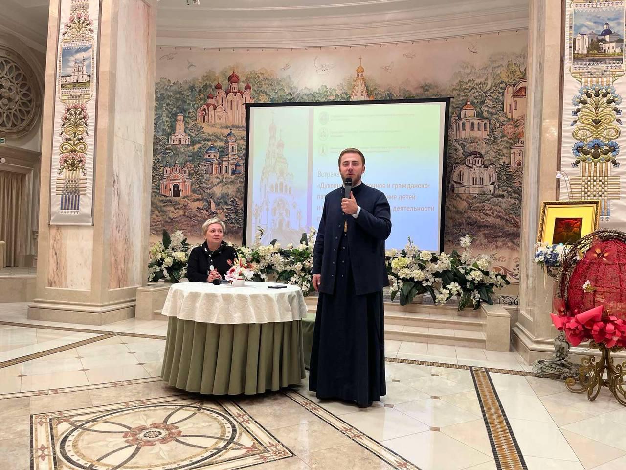 В Белом зале спикеры встречи-семинара – иерей Николай Повный и директор МГТЭЦДиМ Светлана Кравчук обсудили с педагогами совместные мероприятия, проекты по воспитанию, работу с молодежью и вопросы защиты семейных ценностей.